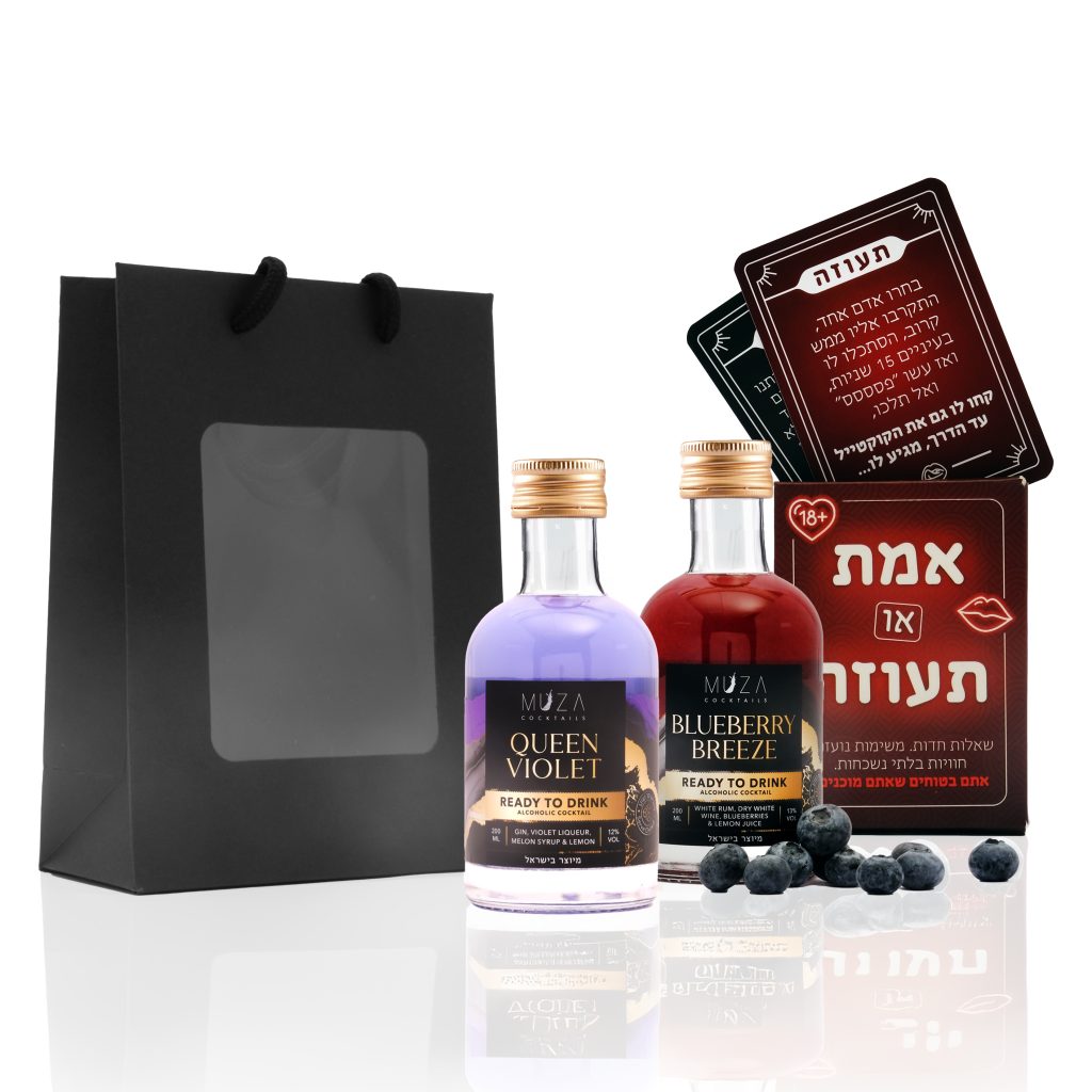 המארז “דייט בקטנה” משלב אלכוהול מעולה עם קצת שובבות , הוא מכיל שני קוקטיילים מיוחדים – קווין ויולט המתקתק ובלוברי בריז המרענן ומשחק קופסא “אמת או תעוזה” שיביא את האקשן הביתה.