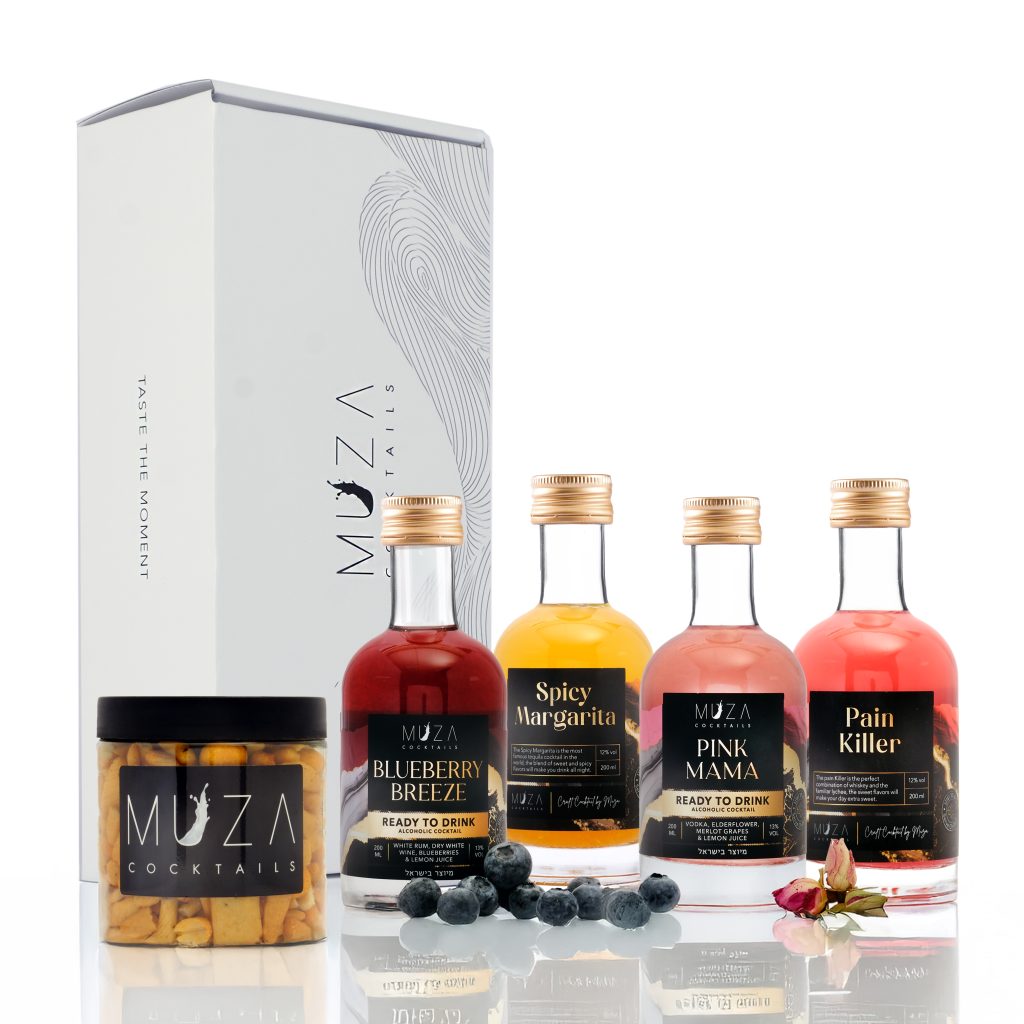 המארז כולל ארבעה קוקטיילים שונים מבין הסדרה הפירותית של מוזה: פיין קילר, פינק מאמא, ספייסי מרגריטה ובלוברי בריז.